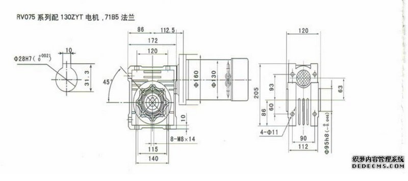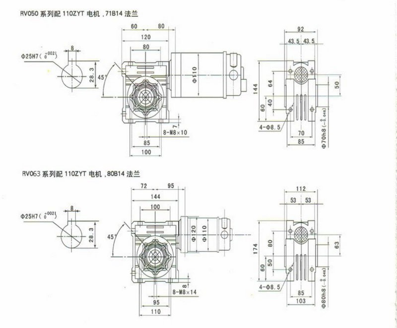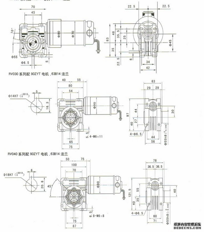 NMRV series worm gear reducer with DC motor RV series worm gear reducer output torque 2.6N. m-500N. m Reduction ratio: 7.5.10, 15 20. 25, 30, 40, 50, 60, 80, 100RV025 series with 70ZYT motor, 56B14 flange